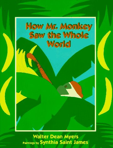 Newbery Honor author Myers (Scorpions; Somewhere in the Darkness) again displays his versatility with this pithy and piquant fable. Repeatedly pulling the same dirty trick, Mr. Buzzard offers, for the price of an item of food, to carry a hare, an antelope, a crab and a monkey ""up to the clouds,"" so that each can be the first of his species to see the ""whole world."" But once in the air, the bird scares his victims by turning them upside-down, promising to bring them back to earth safely only if they hand over their entire cache of food. Clever Mr. Monkey finally foils the greedy fellow, who reluctantly returns the purloined victuals. Using repetition to humorous effect, Myers's tale dispenses its moral unequivocally. Effective as his storytelling is, Saint James (Tukama Tootles the Flute) steals the show with her bold paintings. Streamlining her vibrantly hued compositions to a minimalism just short of abstraction, she nonetheless includes some playful particulars: each animal, including the villain, is clad only in boxer shorts; and Mr. Monkey, clinging to the back of the soaring buzzard, brazenly sticks his long scarlet tongue out at his tormentor. Ages 4-8. (Feb.)