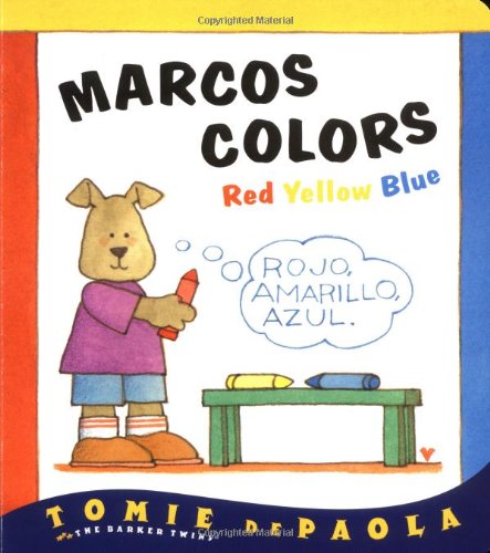 Tomie de Paola brings back the Barker Twins in two bilingual concept books, Marcos Counts and Marcos Colors. In the first title, the youngest Barker learns to count from one to 10 from Moffie, who presents the numbers in English while Marco repeats them in Spanish. They count everything from three-tres-rubber ducks to eight-ocho-crayons, until Marcos leaves and returns with 10 red roses for Mama. In Colors, Moffie's twin brother, Morgie, presents the colors that Marcos repeats in Spanish. The art depicts appropriate objects such as a pumpkin and a tabby cat in orange, or naranja.
