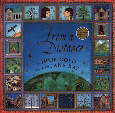 Folk art and folk music join in two-part harmony in this attractive picture book adaptation of song lyrics, made famous on recordings by Nanci Griffith and Bette Midler. The words convey a utopian vision of a world where people can live in peace, concentrating on their similarities rather than their differences: ""From a distance/ You look like my friend/ Even though we are at war."" Reminding readers that ""God is watching us from a distance,"" Gold also urges adherence to a common morality. Ray (The Story of Christmas) makes the most of Gold's ideas of near and far perspective, creating intricate, creamy-hued paintings that are more conceptual than her previous works and tell a distinct story of their own. With each turn of the page, the scenes become increasingly focused and detailed--an effect akin to working a camera's zoom lens. Beginning at a lush, yet universal mountaintop community, Ray homes in on a particular village, depicting families in strife as soldiers and refugees march through the streets and military helicopters whir overhead; two girls pictured together in a window become the aforementioned friends who view each other ""from a distance."" When army tanks roll away from the bombed village, its residents find the strength to rebuild, and the friends are reunited. An appreciation by singer-musician Griffith concludes this uplifting, elegantly designed volume. All ages. (Oct.)
