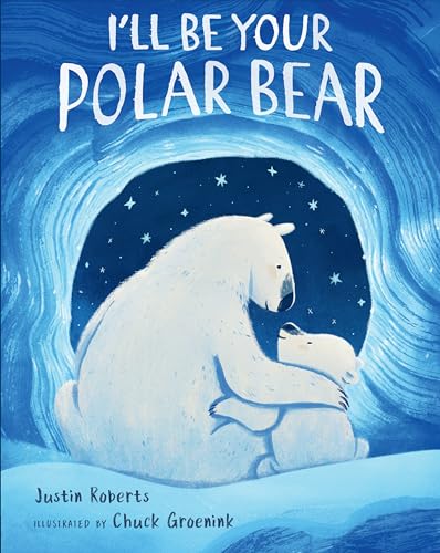 Tender rhymes communicate a caregiver’s bear-size love in this wintry picture book. As night falls, a light-skinned adult and child venture forth on a snowy walk that soon turns blustery, prompting reassuring lines: “And if you get caught/ in who knows where—// then I’ll be your polar bear.” Groenink’s azure scenes, captured with acrylic paint, graphite, and digital techniques, offer a literal interpretation, showing the subjects transformed into furry-looking polar bears as they ice skate figure eights, shelter in a cave, and observe a yellow and pink aurora. Throughout, lines stress the constancy of the narrator’s love even in the face of hardship, comforting that “if rain begins to fall,/ and shadows start to spread,// I will always be your polar bear,/ stretched out overhead.” When the evening’s adventures come to a close, the pair change back, but the memory of their loving bond lingers. Ages 3–5. (Oct.)