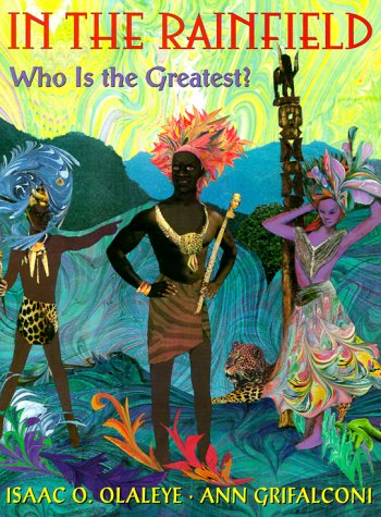 Grifalconi's (The Village of Round and Square Houses) surreal collages explode across the pages of this eye-popping book, layering photographs and cut-paper images against a whirling, swirling backdrop worthy of the credit sequence to a James Bond film. The result is highly kinetic, a mesmerizing foil to a Nigerian folktale about an argument between Wind, Fire and Rain. The three elements--characterized as two men and a woman--squabble over who is greatest and finally hold a contest to determine the mightiest of all. Wind howls, Fire rages, but Rain wins, vanquishing her rivals with a downpour that demonstrates her credo, ""The greatest must be the gentlest."" Olaleye's (Bitter Bananas) prose is sleek and limber, and peppered with African words and phrases (""Village children huffed and puffed, kia kia, kata-kiti, running from the wind""). The language gains extra texture from judicious use of alliteration (""Fire fumed with great fury""). The energy of the folktale is whipped up in Grifalconi's collages, where marbled-paper backdrops (enlarged to set off their exotically curving patterns) provide a '60s-ish psychedelic effect. Between the tempestuous story line and the electrifying art, this is one wild ride from beginning to end. Ages 4-9. (Feb.)
