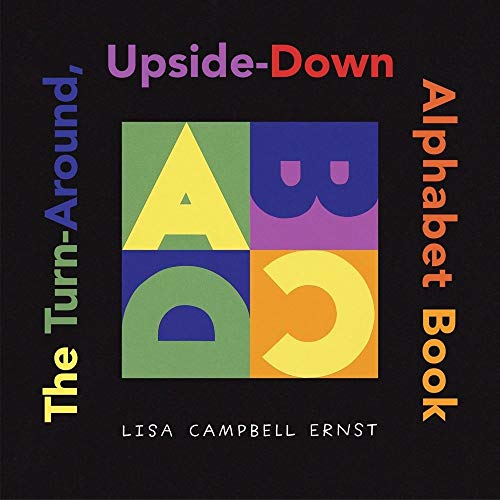 ), however, gives the idea a new twist—literally—by asking readers to rotate her exuberant book 360 degrees, to view each letter from four different perspectives. Working with cut paper, Ernst sets each blocky, sans serif, capital letter against a square field of fluorescent color; in the black border that frames the letters, the text encourages readers to examine the image from each of four angles (as it wraps around the page): "C pretends to be/ an angel's halo" (as readers turn the book to view the letter, bright yellow on an orange background, positioned so that its curve points up), "macaroni and cheese" (the upside-down "C") and a hoop earring (when it rests on its curve)." Not all the suggestions are compelling—O, for example, resembles a bagel no matter how one looks at it—and some youngsters may need coaxing to notice the conceits that depend on the interplay between the letter shape and its negative space (a lime-green N turned on its side looks like "two tortilla chips headed for guacamole" because the angled lines of the letter create two triangles from the yellow field). But children who are mastering both letter recognition and the mechanics of book-reading should get a kick out of how Ernst rewards them for tweaking the rules. Ages 3-6. (July)