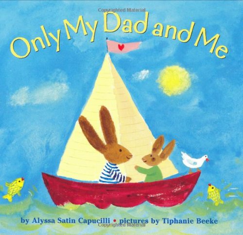 A foldout flap increases the fun in Only My Mom and Me by Alyssa Satin Capucilli, illus. by Tiphanie Beeke. Each spread begins with ""When it's only my mom and me..."" and the right-hand side folds out twice to reveal various activities. ""We take crunchy leaf walks"" shows a mother cat and kitten strolling past a pond in the woods; unfolding the flap reveals their ""long picnic talks"" on a plaid blue blanket, and a final unfolding shows the kitten swinging from a tree. Only My Dad and Me, from the same team, similarly explores a bunny child's experience with father.