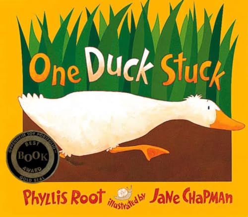 Just as the title of this satisfying counting book says, there's one duck stuck (in the muck, as it turns out). Different groups of marshland creatures, from two fish to 10 dragonflies, appear with an offer of help. Each arrival is described with verbal relish: ""Nine snakes/ leaving little wakes/ slither to the duck./ Slink, slink."" However, no matter what the number or the species, the result is the same: the duck stays stuck. Root's (Mrs. Potter's Pig) wordplay finds an effective visual counterpart in Chapman's (Dora's Eggs) full-bleed gouaches. The illustrator revels in juxtaposing strong colors, so that the hues in her palette pop with a primary-like brightness. But the book does suffer from a major leap in logic: it's never clear how the animals tried to use their distinctive talents in their failed attempts to free the duck. When they all finally gather to effect a joint rescue effort, nothing happens except a recap of the funny noises they make; on the penultimate spread, the duck simply steps out of the goo with a ""Spluck!"" Will children wonder why the duck didn't extract itself earlier? Probably not--they'll be too enchanted by Chapman's vibrant pictures and the immensely satisfying sounds and rhythms of Root's text. Ages 2-5. (May)