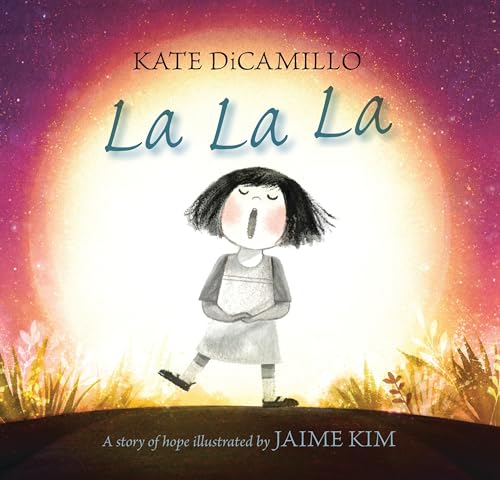 A small girl with blunt-cut hair and a determined look shuts her eyes and folds her hands. “La,” she sings. She tries a few more notes: “La La La.” Nothing happens. She wanders across the pages and outdoors, singing to falling maple leaves. They don’t sing back. She sings to the starry purple sky. Nothing. She drags a ladder outside and climbs up to the full moon: “La La.” No response. Though the girl is singing, she’s not performing or showing off. She’s simply saying: “See me! Acknowledge me! Play with me!” And though recognition is a long time coming, when the full golden moon finally sings back to her, it’s a triumph. Kim’s spreads form a long, almost cinematic sequence. The girl is adorable, though the night world she moves through is dazzling rather than cute—it takes bravery and audacity to sing to that beauty. DiCamillo’s story, told with a single word, is one even youngest readers can understand. Everyone wants to be seen, and everyone wants someone to sing back to them. Ages 4–8. [em]Author’s agent: Holly McGhee, Pippin Properties. Illustrator’s agent: Claire Easton, Painted Words. (Oct.)