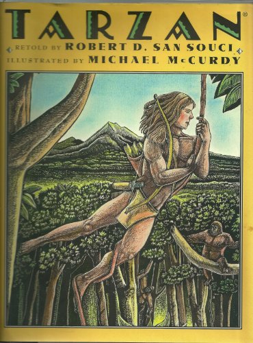 Just in time for the release of Disney's animated feature Tarzan comes this sturdy picture-book introduction to the famous character created by Edgar Rice Burroughs. San Souci (The Faithful Friend) skillfully condenses a complex work of fiction into its key components. He skims over the drama preceding Tarzan's birth to Lord and Lady Greystoke, victims of a shipboard mutiny, and quickly plunges readers into the eventful circumstances of Tarzan's adoption by a young female ape. This treatment emphasizes Tarzan's success in teaching himself to read, and his use of intelligence along with physical strength, a combination that results in his becoming king of the apes. San Souci's expert pacing and sense for the essential story line give his adaptation an air of completeness. An endnote addresses literary and philosophical underpinnings of the story as well as the author's use of the source material; it may well inspire kids to one day seek out Burroughs's works. In his trademark style, McCurdy's (Iron Horses, reviewed above) crisp, full-color scratchboard compositions feature lush foliage and menacing wild animals--they bring the African jungle to life. Ages 5-9. (June)