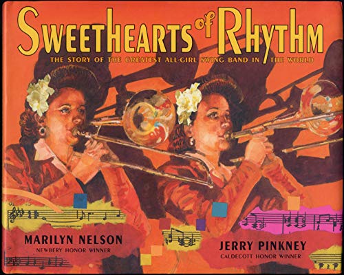 ) execute a masterful duet in this tribute to an integrated female band that toured the U.S. between the late 1930s and mid-1940s. In 20 poems titled after swing tunes, Nelson writes in the voices of the Sweethearts’ instruments, now gathered in a New Orleans pawnshop. Connecting music to greater human truths (some dark, some triumphant), the verse strikes nostalgic yet celebratory notes, underscoring how the band’s music delivered joy and hope during an era plagued by war and racism (“The jitterbug was one way people forgot/ the rapidly spreading prairie fires of war./ Man, the house would bounce when her licks were hot!/ We gave those people what they were dancing for”). Rendered in graphite, color pencil, watercolor and collage, Pinkney’s luminous, multilayered paintings superimpose snippets of musical notation on images of the musicians and audiences in full swing. Balancing these rousing scenarios are less uplifting but no less striking signs of the times: segregated sinks in a washroom, soldiers marching off to war. On all fronts, a resonant performance. Ages 10–up. (Oct.)