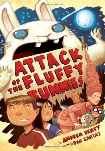 In this screwy, nonsensical thriller, 11-year-old twins Joules and Kevin are unwillingly deposited at Camp Whats-itooya, an unusual summer camp that is about to be attacked by giant alien bunnies (aka “Fluffs”). Led by a naturephobic scientist, a down-on-his-luck surfer, and a beehive-haired lady with a craft fetish, the twins are joined by three giggling look-alike campers dubbed “SmellyCat” (for Sam, Ellie, and Cat), and Nelson, who exuberantly promotes the virtues of the Plumbing Channel. As the bunny threat grows, Nelson and the twins hatch a plan involving Spam (the edible kind) and freeze-dried ice cream to thwart them from taking over the camp and the world. Interspersed with parenthetical asides, directives to the reader (“Those of you who avoided reading Table 1 probably ought to be brave and read this one.... Go ahead. We’ll amuse ourselves by singing while you read. La la la la la...”), and Santat’s (Chicken Dance) kinetic comic book–style panel art, Beaty’s (Cicada Summer) storytelling is lighthearted and fast-paced. Though the story may not linger much past the last page, her unconventional and entertaining narrative make it a wholly fun read. Ages 8–12. (May)