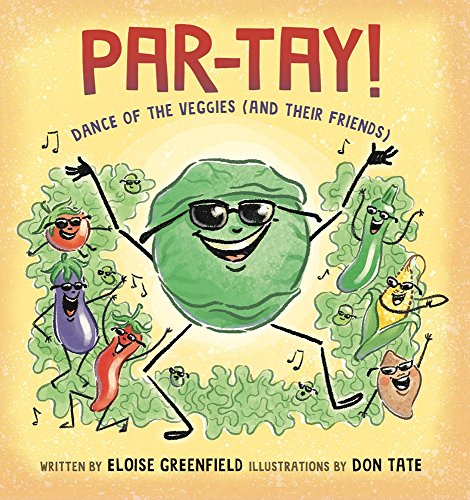 When the humans go out for the evening, the vegetables in the fridge—along with the sweet potatoes in the bin—go wild. “Par-tay!” shouts the cabbage—which becomes the book’s refrain—and with the eggplant, basil, tomato, and Swiss chard on instruments, everybody else takes a turn on the floor. The baby limas, who can “barely stand at all,” try their best to do the wobble dance; the corn and arugula waltz; and the sweet potatoes, dressed in pink tutus, do pirouettes. Greenfield writes vivid verses, with breezy references to different dance styles and flashes of real comedy (“Somebody save me!” says the ecstatic asparagus after “doing the pop”). And while the repetition of “Par-tay!” adds crowd-pleasing fun and predictability, a new chant of “Go, ’Choke! Go, ’Choke! Go, ’Choke!” inserts some irresistible surprise. Except for the refined waltzing couple, all the vegetables share a happy-go-lucky, jazzy vibe. Tate’s big shapes, bold colors, and infectious beats will hold up to many readalouds. Ages 5–7. Author’s agent: Marie Brown, Marie Brown Assoc. Illustrator’s agent: Caryn Wiseman, Andrea Brown Literary Agency. (Apr.)