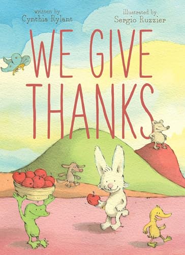 On the title page of this journey in couplets, a lanky-limbed rabbit and frog approach a house in a sun-drenched, fancifully colored landscape. “We give thanks for mittens/ and for coats and boots and hats,” Rylant’s gentle verse begins, as the rabbit and frog speculatively don clothing before a mirror. “We give thanks for nice warm soup/ and fires to warm our toeses,” a later spread continues. Fine-lined pen-and-ink art show a rat-manned bonfire and a great soup cauldron set outside, awash in watercolor hues. The concluding feast assembles all of the anthropomorphic animals the duo has visited in a tiled kitchen as they sit down to a tableful of elaborate desserts. Even simple generosity is conceived of in droll, unexpected ways as a bear slips a cookie under the table to a fish in a bowl in Ruzzier’s fresh-eyed interpretation of Rylant’s simple, holiday-ready blessing. Ages 2–8. (Sept.)