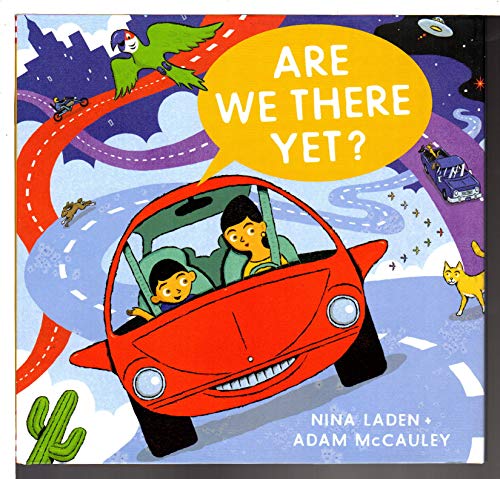 A dark-haired boy and his mother drive to his grandmother’s house, and before they’re even out of the neighborhood, he’s asking the question of the title. The voyage turns out to be anything but ordinary as increasingly surreal sights appear in the ever-changing landscape. In a desert, a distant volcano erupts, and a T. rex emerges from behind a heap of rocks; a detour under the ocean offers a glimpse of a parrot in a diving suit, while the final leg of the trip sees them traveling through a cosmic wormhole in what appears to be an homage to 2001: A Space Odyssey. Laden (Once Upon a Memory) keeps the text to the exchanges between mother and child (“Are we there yet?” “No”) while McCauley (Smarty Marty’s Got Game) toys with recurring motifs as jackalopes, minotaurs, butterflies, cowboys, and more reappear in signage, topiaries, and unlikely environments. The twisting, cyclical movement hints at deeper metaphysical quandaries (where is “there,” exactly?). In the end, “Are we there yet?” is the least of the questions raised. Ages 3–5. [em]Author’s agent: Laura Rennert, Andrea Brown Literary Agency. (Mar.)