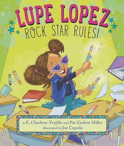 Drummer Lupe Lopez, a “real-life, Texas-size rock star” portrayed with brown skin, has a rebellious, big-ego persona—and discovers on the first day of kindergarten that it’s the complete opposite of what classroom life requires. Ms. Quintanilla promptly lists rules for being a “school rock star”: listen to your teacher, use your inside voice, and be a friend. Lupe’s asked to refrain from wearing sunglasses inside, drumming anywhere she pleases, and shouting “¡Soy Famosa!” in the lunchroom. What’s more, Charlton-Trujillo and Zietlow Miller reveal, her peers are not interested in being her personal fan club. In adhering to the rules, Lupe becomes more approachable, even learning that her classmates, who appreciate her talent, are eager to start a band. Employing Spanish words and onomatopoeia, and Cepeda’s full-bleed, sunshine-bright cartoons, this story assures even the most exuberant kid that they can master the big social-emotional task of kindergarten: holding onto individuality while becoming part of a community. Ages 3–7. (June)