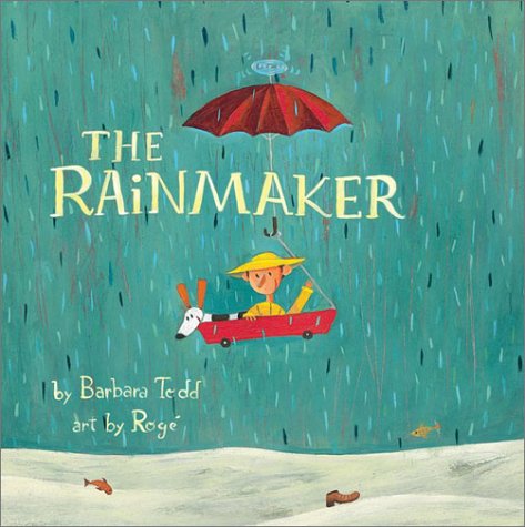 A cloud of confusion hovers over this fanciful story of a boy who discovers how to make rain. Despite the tenuous story line, the details at times provide an intriguing window into young Clarence's curiosity: "He wondered if clouds tasted good. If you ate one, would you float?" Yes, Roge (When Pigs Fly) answers, painting the hero in a puffed-up yellow slicker, floating happily above the city. Clarence notices a sign over a tap that says "rain" (the "d" of the word "drain" has worn away). " 'I wonder...,' said Clarence. 'If I turn on the tap, will I really make rain?' " (Readers may well question why a faucet had been labeled a drain.) A torrential rain ensues, and "the Rainmaker," a bearded man sporting a long coat and hat, appears with a cart of magical umbrellas. The narrative wanders through whimsical but strangely incongruous scenes. The umbrellas cause mischief (one causes rain to fall only under the umbrella; another with a duck handle "quacks" at the man holding it); a flood ensues, and the boy can't turn off the rainfall until the Rainmaker returns with an oil can; and the man shares his duties with Clarence (giving him a handbook, some umbrellas, a paint can for rainbows, etc.). Adopting an appealingly naïve style in his acrylics, Roge peoples this nonlinear world with button-eyed characters and funky, distorted perspectives. In one scene, wind pushes Clarence "upside down and backwards" and an observant, galoshes-wearing beagle does a triple-take. Saturated aquas, blues and olive greens lend the antics a pleasingly damp atmosphere in this paper-over-board book. Ages 4-7. (Apr.)