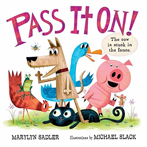 When Cow gets stuck in a fence, Bee springs into action: “Bee buzz-buzzed to Frog’s pad and said: ‘Cow is stuck in the fence. Pass it on!’ ” As the message travels, however, it gets mangled beyond recognition. “Cow has money. Pass it on!” shouts wide-eyed Kitten to Mouse, who’s hanging out in the cupboard with the canned veggies and tuna. As befits the vintage nature of the game of telephone, Slack’s (Monkey Truck) artwork conjures images of early Golden Books like The Little Red Hen and The Poky Little Puppy. Frog, sitting on a lavender mushroom playing with a yoyo, has appendages reminiscent of a 1950s atomic starburst design; bright blue Goose strums a guitar in a finale that has the animals celebrating Cow’s eventual rescue with a milk-and-