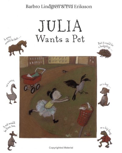 Seven-year-old Julia is a force of nature in a tutu, boots and pigtails—and another memorable character from the team behind Andrei's Search. On the lookout for a much-wished-for pet—preferably one that will fit in her baby carriage—Julia darts through town, forming an alliance with a boy who imagines himself to be a steam locomotive and calls himself "Engine." She temporarily lays claim to someone else's dog (for which she is roundly scolded) and unsuccessfully attempts to transform Engine into her pet (he "isn't exactly an animal, but she can see that he's just the right size for the baby carriage"). Lindgren's bracingly straightforward prose makes Julia's yearning and perversity feel immediate and authentic. Yet the plot is almost beside the point—as the tongue-in-cheek ending seems to acknowledge. Rather, it is the unabashedly single-minded Julia herself who will hold readers' attention from start to finish. The girl's wiry limbs, dot-eyes and scraggly hair radiate a resolve that's both steely and vulnerable; and while Eriksson's brown-and-yellow–toned pictures may seem subdued at first glance, the earthtone colors and subtle pencil textures ground the heroine in the real world, while her yellow tutu and red baby carriage add playful tones. Ages 4-8. (Sept.)