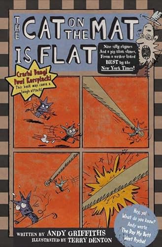 ) innovative book for beginning readers collects nine short, intentionally silly snippets propelled by kid-pleasing, tongue-tripping verse. In the title tale, a cat sitting on a mat decides to chase a rat, who grabs a baseball bat: “Around and around and around the mat the rat chased the cat with the baseball bat until... KERSPLAT!” Other protagonists also encounter tongue-in-cheek adversity. Friends Ed and Ted and Ted's dog Fred survive a tumble off a cliff, a near-drowning and ingestion by a whale. Lou, “the unluckiest girl that the world ever knew,” becomes covered in a kangaroo's glue and then lands headfirst in a “prickle bush.” And pals Bill and Phil roll down a hill, landing in a puddle of smelly pig swill. Griffiths's bouncy cadence and wacky wordplay occasionally sound derivative of Dr. Seuss, as when a hog reprimands a speeding dog and frog: “Racing is NOT allowed in my bog! Not on a log! Not on a cog! No log-racing frogs! No cog-racing dogs!” And when Chuck the Duck's ice-cream truck gets stuck in the muck, Buck the Duck announces, “I can get your truck unstuck. I can suck up all the muck with the muck-sucker-upper on my muck-sucking truck!” Denton's edgy, stick-figure-filled sketches enhance the zaniness factor and the offbeat, ironic humor. Ages 4-8. (Sept.)