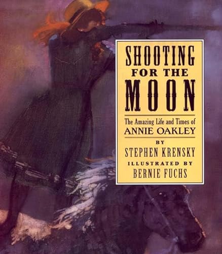 Fuchs's (Ghost of the Southern Belle) light-dappled, impressionistic oil paintings provide a dramatic backdrop to this picture book–biography of 19th-century sharpshooter Annie Oakley. As a child, Annie helped support her impoverished Ohio farming family with her hunting skills and, at 20, outshot a professional, Frank Butler, whom she later married. Stepping in for her husband one night at an exhibition, she became an instant hit with the crowd ("A woman who could shoot like Annie was a rare sight indeed") and her speed, accuracy and daring stunts—such as shooting an apple off her dog's head—earned her a spot with the circus, then with Buffalo Bill's Wild West Show, where she went on to fame and glory. Krensky (How Santa Got His Job) paints a vigorous portrait of this legendary sportswoman, drawing from her own diaries for the crisply informative text and afterword. Fuchs heightens the drama by drenching his canvases with layers of earth tones and touching the shadowy images with light, from the reflection on the glass balls Annie targets to the gleam of the sun through the high canopy of trees in the Ohio forest. "Aim at a high mark and you will hit it," was Annie's life motto—words which effectively describe this bull's-eye of a collaboration as well. Ages 5-8. (Sept.)