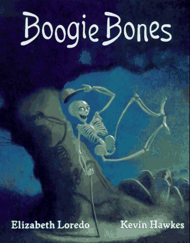 Boogie Bones, the best skeleton dancer of all, practices his jitterbug in a misty, moonlit cemetery. Although he and his clattering cohorts are ""a bit frightened of people, who [have] no bones about them,"" he slips into a moldy tuxedo, baseball cap and mustache disguise to attend a dance contest among the living. There he watches a couple who cha-cha with ""noses turned up and toes turned down,"" then selects a partner for the tango. His rambunctious behavior lands him in trouble, however. When Boogie's disguise flies off and his secret is revealed, the author resorts to a generic gambit: a fearless girl steps from the horrified crowd to trip the light fantastic. Hawkes (By the Light of the Halloween Moon) contrasts shadowy midnight scenes, shrouded in greenish pastel fog, with the brightly lit, golden interior of the dance hall. He rises to the challenge of making the skeleton's face expressive, although highly observant audiences may wonder how Boogie can squint his eyes with glee. An apt closing image--a dance trophy against a granite headstone--sums up the volume's gothic humor. Meanwhile, Loredo's (Mystery on the Mississippi) homespun narration evokes good-natured charm rather than morbid and ghostly thoughts, and ends on a witty, ironic note (""That was the happiest night of Boogie Bones's life""). Ages 4-8. (Aug.)