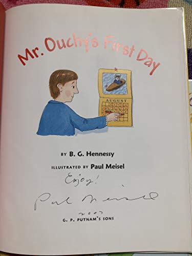) charming story reassures children that they are not the only ones worried about starting school. Mr. Ouchy, a new teacher, expresses concerns that will seem familiar to young readers ("Will I remember everyone's name? Will I be able to find the bathroom?"). Broken into short chapter-like segments, the quick-moving narrative begins with the fellow in the barbershop, getting a haircut on the eve of the first day. Later, he has trouble falling asleep and counts sheep that "start to look like children." Here, Meisel's (Zara's Hats