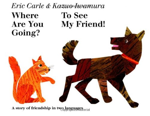 Each author/artist relates the same cumulative story about a dog on its way to a human friend, gathering other animals along the way. With minimal text featuring an exuberant refrain (" 'May I come with you?' 'Yes, come along./ Our friend is your friend' "), each artist renders the scenario in spare artwork, rendered in his own distinctive style. Carle's English version begins at the front of the book and Iwamura's (the Fourteen Mice series) version, as is the custom in his native Japan, begins at the back. The two tales meet in the middle with a gatefold spread that unites the two human friends (Carle depicts a boy with a guitar, Iwamura a girl shaking a tambourine); youngsters open the gatefold to find the respective menageries in tow, and a song—with melody line provided—that incorporates all of the animals' sounds (in their order of appearance: "Bow Wow Wow/ Meow Meow Meow/ Cock a dood-le doo/ Baa Baa Baa/ Hop Hop Hop") in both English and Japanese. Inventively, as the story progresses, a small icon (a bunny with long ears; a boy with a baseball cap; etc.) designates each speaker's voice.