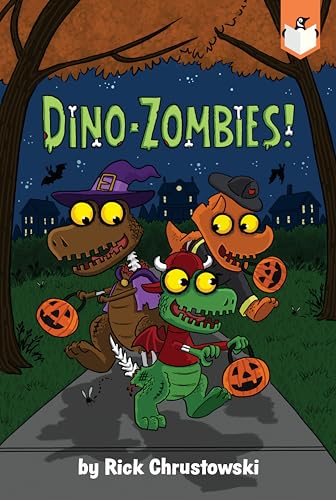 Forget brains—dino-zombies need sugar to survive, and Halloween night is the perfect time to fuel up. Chrustowski’s boldly hued crew, crisply outlined in black, don their costumes and stomp through the streets amassing loads of candy. “Zombie-raptor!/... Zombie-saurus rex!/ Ding-dong, ROAR! Ding-dong, ROAR!/ They’re the candy-saurus wrecks!” The dino-zombies—whose bones protrude from their meaty bulk—hit pay dirt at the neighborhood costume party (“Candy bars and popcorn balls!/ Dino-zombies chomp them all!”) and even take home first prize for their impressive getups. And once “they’re crashing from the sugar rush,” the dino-zombies are soon quiet and comfy at home in their “fuzzy jammies.” The combination of spare text, chunky font, and playfully spooky critters with yellow glowing eyes make this a treat for early readers stimulated by the sugary holiday’s fun. Ages 6–8. (Aug.)