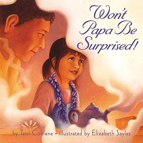Everything reminds Mikele of ribbons as she goes through the day doing chores alongside her father, and no wonder-she's prepared a blue ribbon (which says ""My Papa"") for a Father's Day gift in Won't Papa Be Surprised! by Terri Cohlene, illus. by Elizabeth Sayles. The layered pastels of the illustrations create movement in the garden where the pair weeds and in the windsock suspended above the porch.
