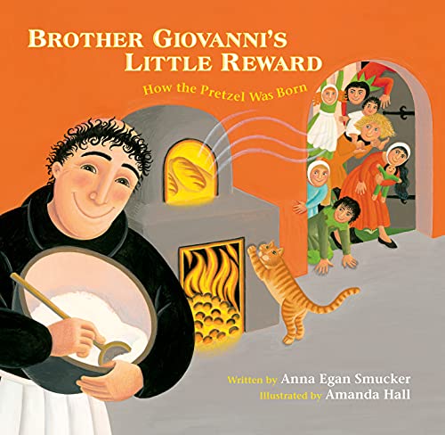 Drawing from the semi-apocryphal origins of the pretzel, which trace the baked good to a monk in medieval Europe, Smucker (Golden Delicious) introduces Brother Giovanni, “the best baker his monastery had ever had.” With the bishop scheduled to visit the monastery, the children the monks teach must learn to recite their prayers before his arrival. Giovanni tries singing, making “mean” faces, and dancing with the children, but while these attempts bring him closer to the children (the genial monk’s efforts to frown have the children rolling on the floor with laughter), they don’t help them learn their prayers. Taking inspiration from the medieval setting, Hall (The Fantastic Jungles of Henri Rousseau) ornaments her bright, playful paintings with filigrees and other decorative elements. When Brother Giovanni has his eureka moment—using the shape of two arms crossed in prayer to create a snack for the ages (and a delicious reward for the children)—he is flanked by two trumpet-playing angels, and a pretzel rests above his head like the flame of the Holy Spirit. It’s a winning blend of the holy and the holey. Ages 4–8. (Aug.)