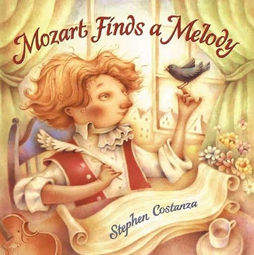 ) fictional picture book stars Mozart as a young man struggling with composer's block. Despite several tactics (singing while standing on his head, throwing darts at sheet music) he is unable to write the concerto that is to be performed in five days' time. Then Wolfgang finds unexpected inspiration in the 17-note song of his pet starling, Miss Bimms. When he tries to thank the bird with a kiss, she flies out the window. Wolfgang searches the bustling streets of Vienna for her, to no avail. However, he suddenly realizes that all of Vienna can contribute to his song, from the rhythmic rotation of carriage wheels to the hearty laugh of a baker: "A little more vibrato, if you please, Herr Schafle." As Mozart conducts the completed concerto before a delighted Austrian audience, Miss Bimms, perched atop Saint Stephen's Cathedral, recognizes her melody and soars onstage for her debut. Costanza uses a mix of acrylics, gouache and colored pencils to create dreamlike illustrations that suggest the elusive imagination at work. His surreal blends of muted colors often incorporate a repeated element of scrolls and sheet music. One inspired spread shows the composer's hand-inking notes, while townspeople walk along the staff lines—a flower saleswoman morphs into a flute as she sings and a goose honks into a French horn. This clever and delightfully rendered homage proves the author to be a true aficionado. Ages 5-9. (Sept.)