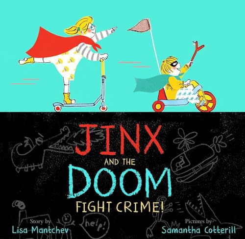 They defend the innocent—from a washing machine turned monster. They protect the planet—from a Godzilla-like creature menacing a toy city. And then they stop to have lunch. It’s all in a day’s work for two siblings in this imagination-fueled superhero story. Mantchev (Someday, Narwhal) even gives her heroes an origin story: Jinx and her brother, the Doom, “used to fight each other. But then they realized they could use their powers for good and not evil.” Cotterill (No More Bows!) embraces a comic-book aesthetic in hip dioramas featuring paper-cut characters and dramatic shadowing; during a mission from headquarters (aka Mom) to wash the pet dog, the canine casts a fierce shark shadow as it runs away from the tub. Cotterill’s vivid images capture the way pretend play can transform even the most mundane activities into adventures waiting to happen. And with superheroes everywhere in pop culture, Mantchev offers a fun introduction to what fighting crime is all about for kids who aren’t ready for the latest blockbuster action film. Ages 4–8. [em]Author’s agent: Laura Rennert, Andrea Brown Literary. Illustrator’s agent: Kirsten Hall, Catbird Agency. (Feb.)