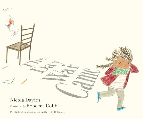 Gentle, childlike drawings by Cobb (There’s an Owl in My Town) help soften the blows in this story by Davies (King of the Sky), published in association with Help Refugees, about a girl in a country at war. War comes one day when she’s at school—not in the morning, she explains, when her class is learning about volcanoes and tadpoles, but in the afternoon, “just after lunch.” The juxtaposition of the girl’s routine and the catastrophic events heightens the tragedy. The war, portrayed as a big ashy cloud, destroys her home and family: “War took everything./ War took everyone.” When she finds her way to another country in a stream of refugees, a schoolteacher refuses her a place in class, and she realizes that “war had gotten here, too.” She is slumped in a dark corner when a boy opens the door and offers her a chair: “My friends have brought theirs, too, so all the children here can come to school.” Though Davies suggests that everyone has to lend a hand to push hate away, sensitive readers may be too distressed by all that has occurred to take in the children’s generous impulse. Ages 6–9. [em](Sept.)