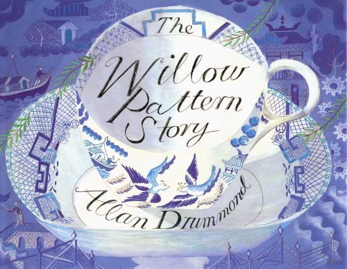 The author's childhood fascination with the classic blue and white willow pattern on a jug owned by his parents inspired this absorbing and distinctive story told within the willow pattern itself. Drummond begins by visually orienting his audience above a willow pattern cup and saucer, drawing readers around and into the intricate design as he tells of a star-crossed Chinese couple, Koong Shee and Chang. Gradually, the pattern's various elements are brought to life: the pagoda is Koong Shee's home; the bridge and boat are the means by which the pair escape the wrath of Koong Shee's father, who opposes their match and ultimately captures them; and the hovering birds become the lovers, eternally reunited after their deaths. The curved borders at the bottom of several pages serve as subtle reminders of the story's backdrop, but Drummond overcomes this potential restriction by elaborating on it for dramatic effect. One particularly striking spread portrays the lovers imprisoned by Koong Shee's father by being pushed off the center of the page/plate into the bordering maze. An afterword details the pattern's history. This ingenious use of uncommon source material may inspire readers to watch for hidden stories in everyday objects. All ages. (Sept.)