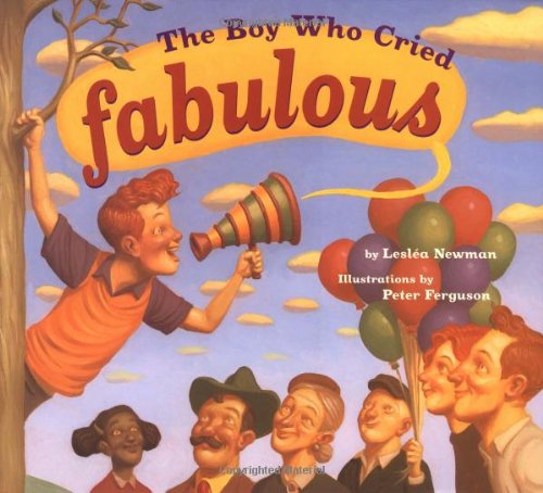 !" he notes, as the realization of his tardiness hits), Roger tries to curb his enthusiasm. But when he goes into town with his parents, he teaches them an important lesson: fabulous is fun. Roger's vocabulary of exhortations (which eventually include "splendid," "luscious" and "scrumptious") is not au courant, but Ferguson, making his children's book debut, smoothes over that potential speed bump with burnished, acrylic paintings that depict Roger as a lively visual throwback. The boy's shockwave of red hair and high-cheeked, bright-eyed face brings to mind Superman