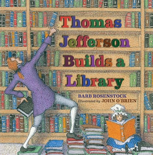 Thomas Jefferson “gobbled books the way a starving man eats.” Rosenstock’s (The Camping Trip That Changed America) apt metaphor sets the tone for this jaunty picture-book biography of the third U.S. president. Following Jefferson’s birth in 1743 to his restocking of the Library of Congress in 1815, the playful narrative (“While at college, he read fifteen hours a day. Guess what he started collecting?!”) complements even more playful illustrations. O’Brien’s (Look... Look Again!) dynamic ink-and-watercolor illustrations show the redheaded leader in perpetual motion around books, exaggerating his hobby to humorous effect. Jefferson stacks tomes on his mantel in the shape of the word “books” or reads several books at once by swinging from a trapeze. Pointillist dots overlay the artwork, texturing O’Brien’s pictures with a mottled look. Readers’ eyes will dart among several scenes in each spread, the busy layout giving a sense of Jefferson’s full education-driven life. Appearing on nearly every page are images of small, open books that provide further biographical facts and quotations. Author notes and a bibliography wrap up a lively peek at a literature-loving political giant. Ages 8–up. (Sept.)