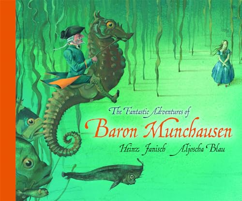 In his retellings of the Baron's tall tales, Janisch (I Have a Little Problem, Said the Bear) combines the bravura of Paul Bunyan with the elegance of Voltaire's Candide. Each story appears on the left, accompanied by a painting on the right of the beak-nosed Baron, nattily turned out in a dashing military tailcoat and tricorner, always placid despite the unusual circumstances in which he finds himself. "On an impulse I flung myself onto the flying cannonball," he says. "I held tight and felt the wind rush into my face." Blau shows the Baron calmly astride the cannonball, his silver pigtail streaming out behind him. Later, the Baron has a series of underwater adventures, finding a small orchestra in the belly of a whale, exploring the ocean floor on a seahorse ("Fortunately, my father had taught me how to hold my breath under water for hours") and falling in love ("I woke her cautiously and offered her a seat on the back of my seahorse"). Children with a romantic streak will be taken both with the Baron and his courtly fictions and by Blau's misty, stately portraits. All ages. (May)