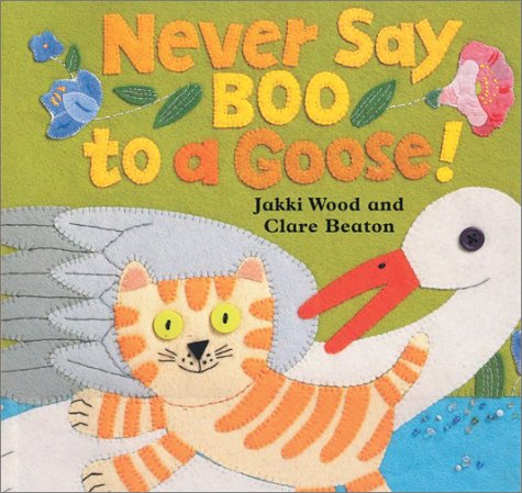 As with Mother Goose Remembers, Clare Beaton's fabric illustrations once again infuse a tale for the nursery set with exuberant energy. A curious kitten disobeys his mother in the paper-over-board Never Say Boo to a Goose! by Jakki Wood, illus. by Clare Beaton. ""I can say `Boo!' to anyone I like,"" thinks the frisky feline, but when he finally comes up against a goose, he's unexpectedly humbled.