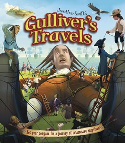 This lively interpretation of Swift's novel contains digital illustrations that look like stills from a CGI film. Readers can take part in lanky Gulliver's outlandish adventures by reading minibooklets, including "Advice for Travellers," and "The People and Customs of Lilliput" (the latter is appropriately tiny), and manipulating flaps and tabs. Castor and Juarez achieve a graceful balance between substantial text and buoyant images, while honoring the noble lunacy of Swift's original. Ages 8–up. (Jan.)